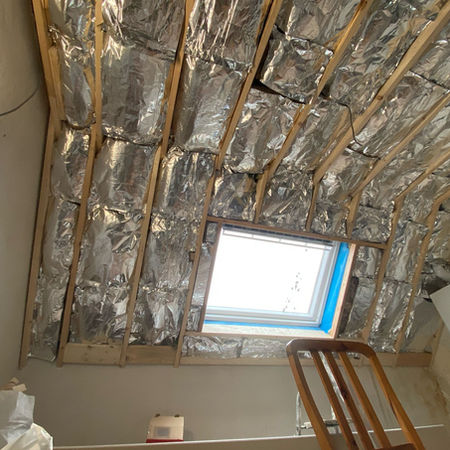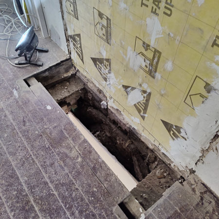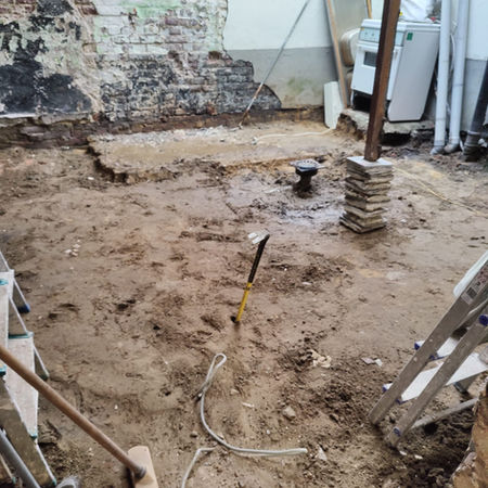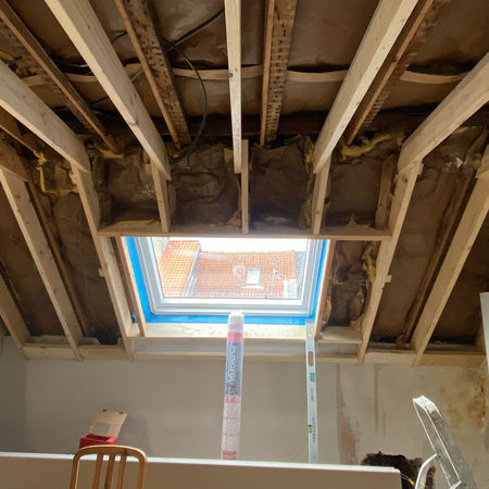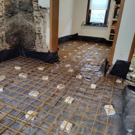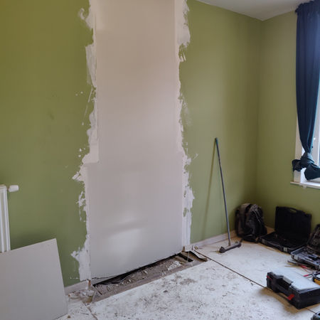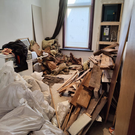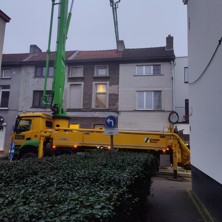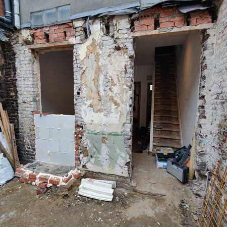 Afbreken uitbouw: keuken toilet, vloerbedekking verwijderen en uitgraven -250, muren afbreken. Gelijkvloers: schouwen afbreken, vloerbedekking (asbest) verwijderen en uitgraven -300 + nieuwe bodemplaat en isolatie. Verdiepingen: schouwen afbreken en aanwerken, nis in dak maken en velux plaatsen